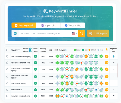 Keyword Finder provides a Weak Spot filter, which highlights underserved keywords that are easy to rank for. These are the ones you should prioritize to gain traction quickly.